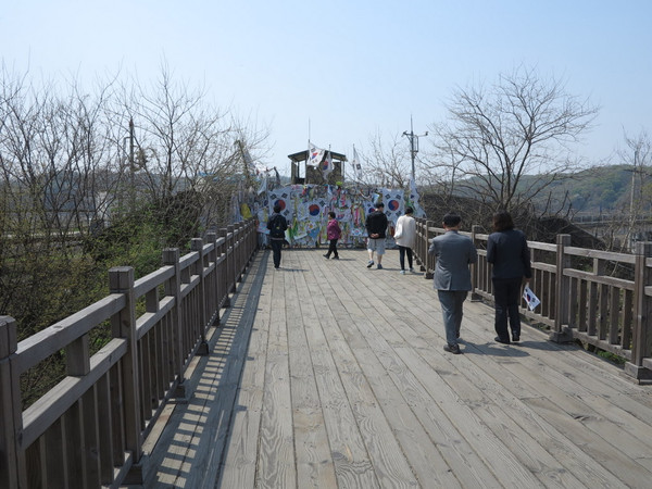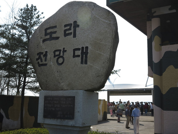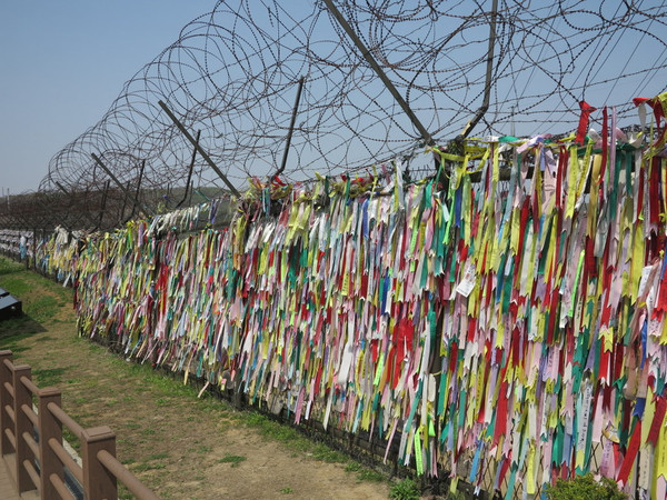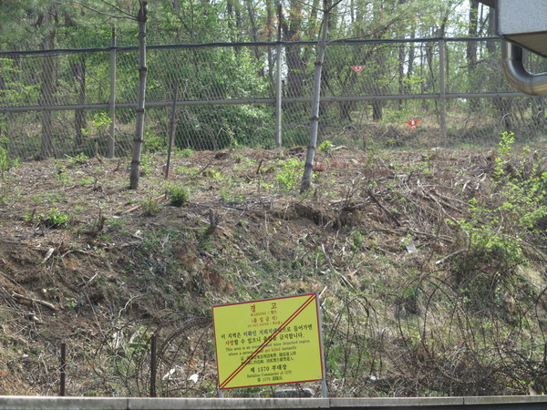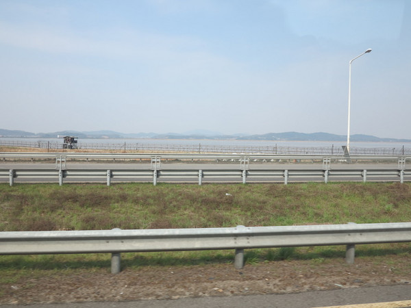 大巴出发,首尔不大,拐过景福宫,沿着韩国的公路前行,不用多长时间汉江边开始有了铁丝网,瞭望塔也越来越多,导游说,韩国这里的山头是绿色的,朝鲜那边是土黄色的,1个多小时的路程在导游的解说下也不枯燥。