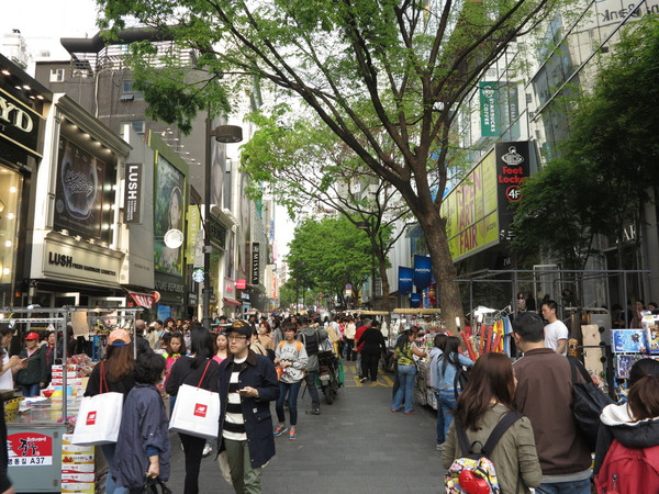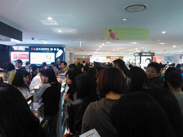 吃饱喝足步行到明洞准备瞻仰一下乐天的免税店,9-11层3层楼面,不上楼还好一出电梯绝对的恐怖,只能说是人山人海,全部汉语交流,怪不得前一天在景福宫遇到中国姑娘的交流都是“你去哪里玩了啊?”“没玩啥,就在买东西,买3000美元,送你乐天世界游乐场的啥免费券。”这里的那些传说中的货物都是排着队的付钱,搞完直接打包发往机场,最后直接机场体货,流水线的服务绝对的恐怖,三层楼几乎涵盖大部分的品牌,只能是夸张来形容,LV都是人流涌动,毫无高端的感觉。