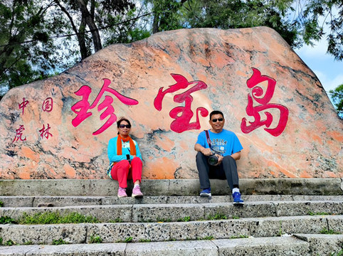 在江畔矗立着的一块巨石上“中国•虎林 珍宝岛”几个红色大字赫然醒目。站在江畔远眺,前方不远就是珍宝岛。岛上的连体建筑群为黄色,一侧高起的圆形瞭望塔上,竖排题写的“珍宝岛哨所”五个金色大字清晰可见。