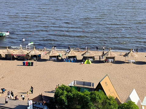 来到景区登上观景平台环视,兴凯湖的湖光山色尽收眼底。一面是清澈见底碧绿的湖水,另一面则是泛黄的广阔水域,而正是这片水域却是游乐区,只见水畔沙滩上是一排排的遮阳伞,数不胜数的游客在水中畅游嬉戏。不知道,还以为到了大海之畔的海滨浴场。