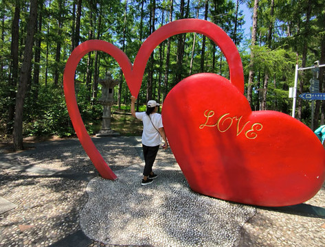 玻璃栈道的尽头是两个红色造型的“心”形,一个是镂空的,另一个则是实心的,在红色实体的“心”型上是金色的英文“love”。经过栈道穿过一片树丛就来到了乌苏里江第一塔前。