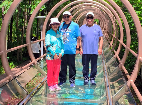 走进虎头植物园内,首先要经过一条长达数十米的环形栈道,栈道为玻璃地面,透过玻璃往下看一幅幅靓丽动人的风景图片。桥的上面是一环套一环的圆圈,游人穿行其中感到十分惬意。