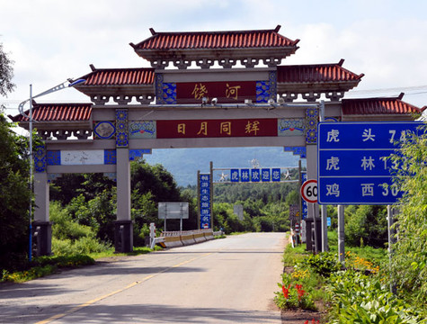 东北度假避暑行的下一个行程是珍宝岛。2023.07.09,记者一行一早从饶河出发,北京时间08:05,孙雷师傅驱车才走了半个多小时,来到了饶河与虎林的交界地。只见饶河的牌楼上方,两个红底黄字的“饶河”下面为“日月同辉”四个大字均十分醒目。