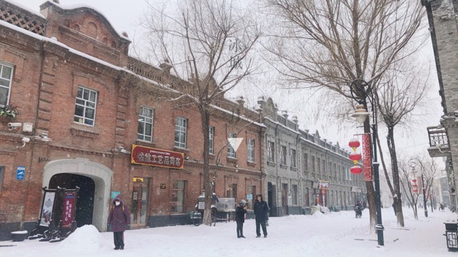 一到冬天,冰城的街道和建筑都被白雪覆盖,洋溢着 俄罗斯 的异国风情,行走在期间,有种 上海 老弄堂的怀旧感。很幸运的第二天出行就遇到整个 哈尔滨 飘着大雪,俄式的外墙建筑,还有墙面上布满了斑驳的痕迹,还有一些支架和电线随意搭着,可能是我们去的早,9点左右很多店铺都没有开门,也有很多店铺在修缮,看到三三俩俩的游客,还有铲雪的店铺员工。
