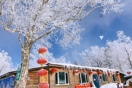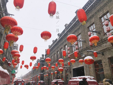 临近新年,风情街里挂满了红灯笼,白色的雪花推在灯笼上,给它增加了一些瑞雪兆丰年的气氛。