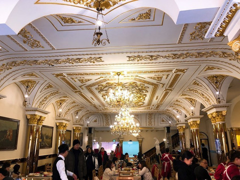 ?第一顿午餐吃的是华梅西的西餐厅,在中央大街中间的位置,是俄式西餐,里面装潢很好看,很华丽的样子,可是俄餐真的吃不惯,点评说推荐罐罐羊肉,可是我真是一放进嘴真的差点吐出来,是很膻很肥的羊肉,在 广东 我们煮羊肉的方法是到很多香料来焖,或者是切成薄片火锅涮,可是这个真的是太难接受了?