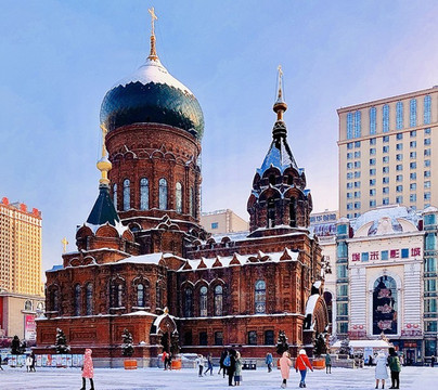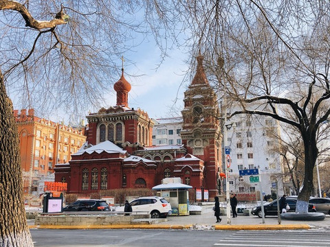 从中央大街走路大概10分钟的样子吧就到圣 索非亚 大教堂?,这座教堂真的好好拍,它坐落在市中心的位置,周围都是其他建筑,显得这座教堂特别的接地气,教堂前的雪也没怎么刻意的铲掉,地上白茫茫的加上红色的教堂真的很好看