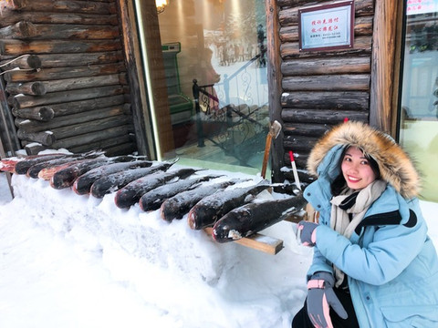 店铺外面整齐地摆着巨形的胖头鱼,这样的 雪乡 真的很有生活气息