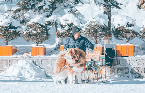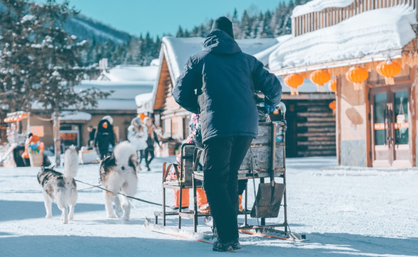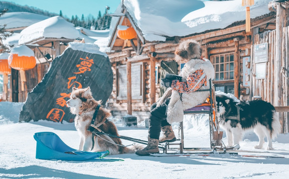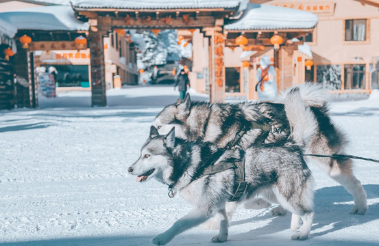 在雪韵大街上,随处可见这样的狗拉爬犁,两只哈士奇或者是 阿拉斯加 ,拴在身上的绳子拉住经过改制的椅子,游客坐在椅子上就可以被拉着向前了。