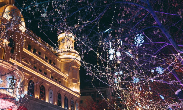 树枝上掉满了等待,雪花挂着枝头,闪烁这灯光。
