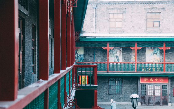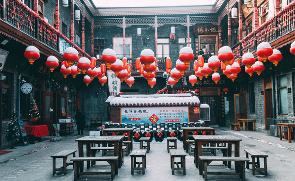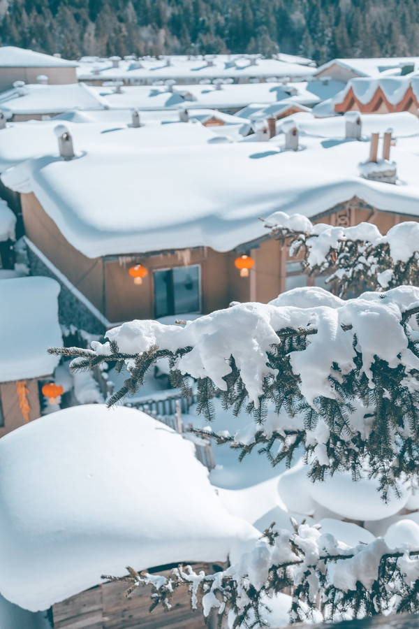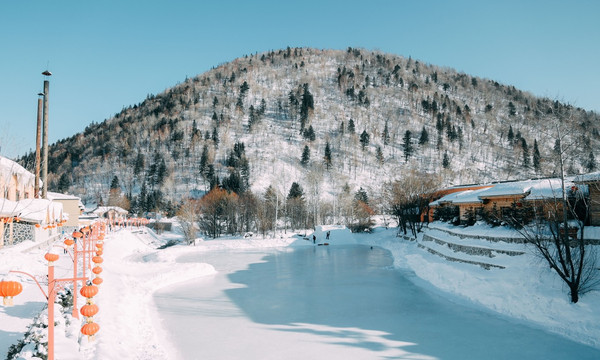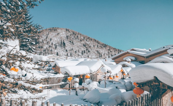 山林、松柏、木屋、积雪以及喜气洋洋的红灯笼。