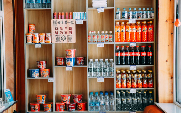 在门口和餐厅,都有这样的商品自取区,饮料、泡面自己扫码购买,矿泉水3元一瓶、可乐5元一瓶,价格并没有比城市贵太多,对于景区来说,这个价钱也是非常的良心了。