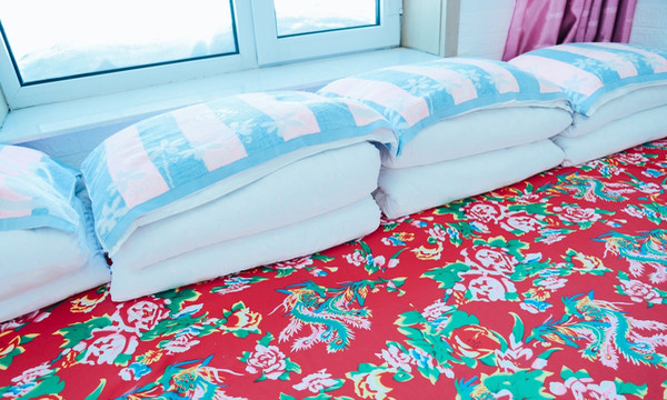 我们入住的是非常有 东北 特色的印花床单炕,这是一个四人间,所以提供了4个人的被褥枕头。