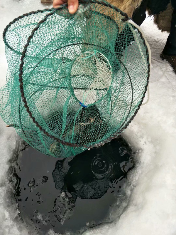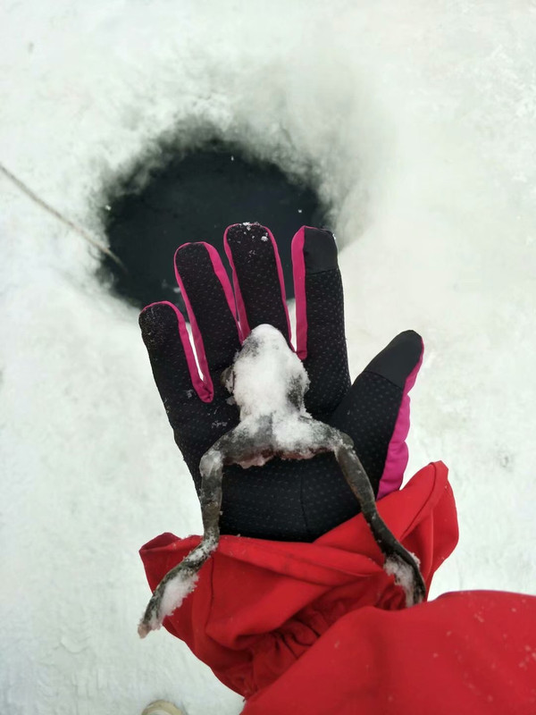 睡了个踏实温暖的舒服觉醒来,漫天飞舞的大雪瞬间把世界染白了,开心的奔入雪地里,各种狂拍。臭美完毕,吃罢早餐,继续坐上大巴前往下一个景点观看冬捕讲解,东北渔民开网捕鱼,预示着年年有余,千里冰封的湖面上,由渔民凿开个冰窟窿,收获起沉甸甸的大鱼与喜悦。我们去的时候没有捕鱼,长长的网笼里捕到的全是林蛙,据说这种蛙就是我们常吃的木瓜炖雪蛤里面雪蛤的主体,而雪蛤竟然是母蛙的输卵管,顿时胃部翻起阵阵不适,我一直以为雪蛤是植物,不曾想竟是这种小动物用来孕育生命繁衍后代的器官,不禁感慨人类的残忍,呼吁大家以后还是多吃素少杀戮吧!