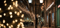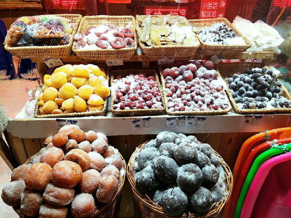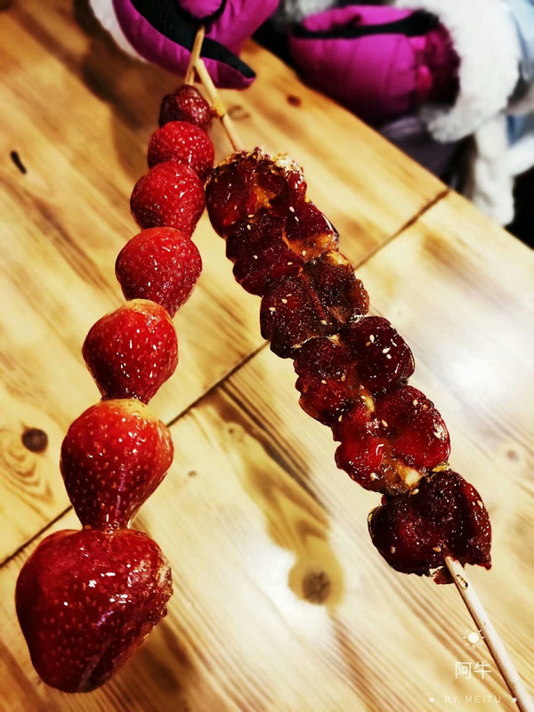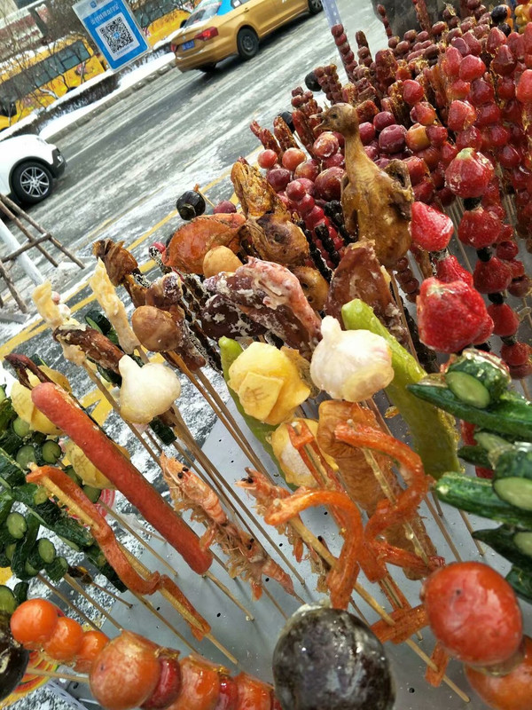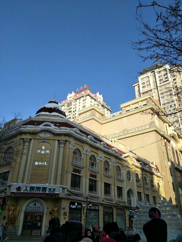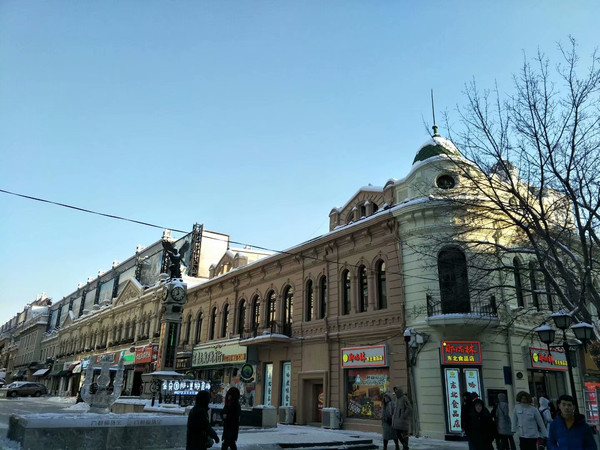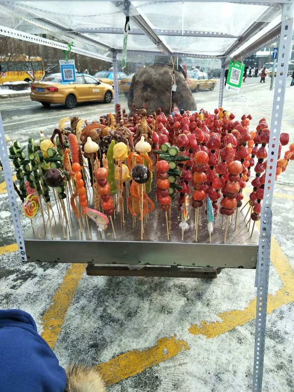 吃完包子出店,没走几步就是中央大街。俄式建筑随意的洒落在纵横的街道上,文艺复兴、巴洛克、折中主义等欧洲风格建筑遍布中央大街,五步一典,十步一观,在西方建筑史上几百年才形成的建筑风格样式汇集街内,使得中央大街成为远东地区最著名的街道。1924年5月,由俄国工程师科姆特拉肖克设计、监工,中央大街铺路用的方块石为花岗岩雕铸,长18厘米宽10厘米,一块一块,精精巧巧,密密实实,光光亮亮。路铺得这样艺术,在中外建筑史上都是少见的。据说当时一块方石的价格就值一个银元,一个银元够穷人吃一个月的。据专家测定,中央大街的方石块还能磨上一二百年。当你走在充满遐想的中央大街上,如果没有一根正宗的马迭尔冰棍相伴,那么所用的遐想都会少了梦幻的成分。马迭尔冰棍作为中央大街陪伴者,回荡着那种浪漫的味道,但因天气太冷,之前泡温泉的时候已经尝过,我们就没敢在室外尝试,万一又把嘴巴粘上,那就必须是血淋淋的撕拉下来了。放弃冰棍,可以体验冰糖葫芦,在哈尔滨,所有的食物都可以是冰糖葫芦,面筋、秋葵、辣条、鸡爪、鸭脖、蒜头、青椒、鹌鹑、年糕、螃蟹、虾,只有你想不到,没有东北人做不出来的糖葫芦。