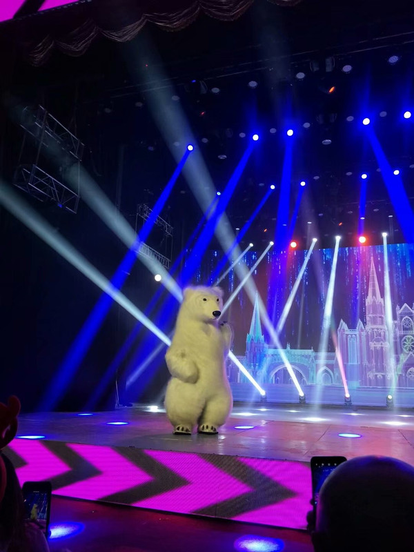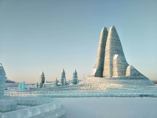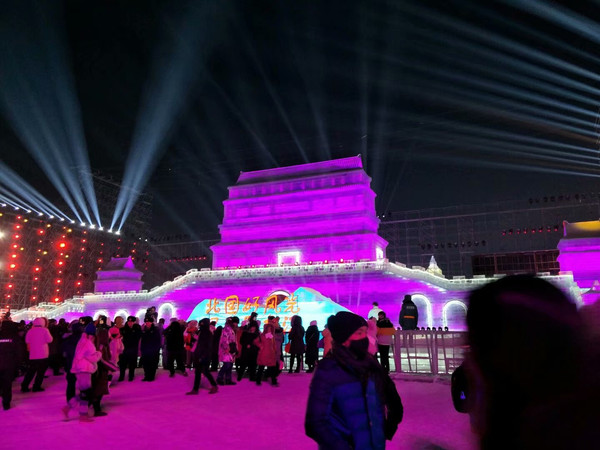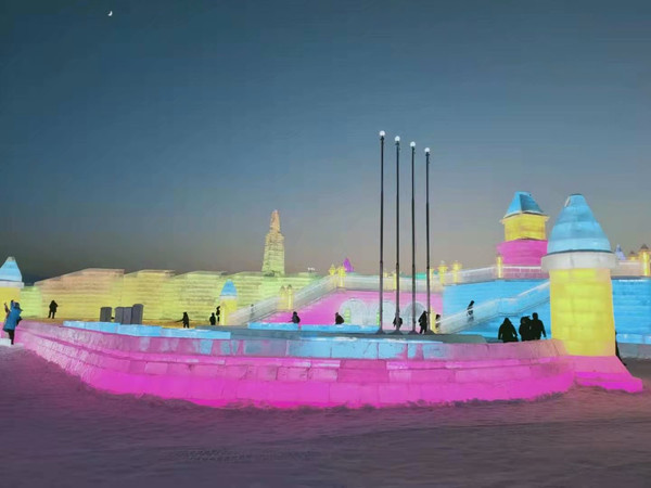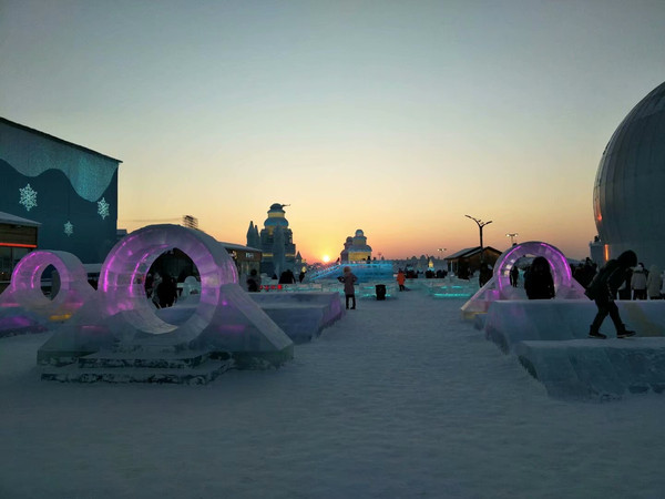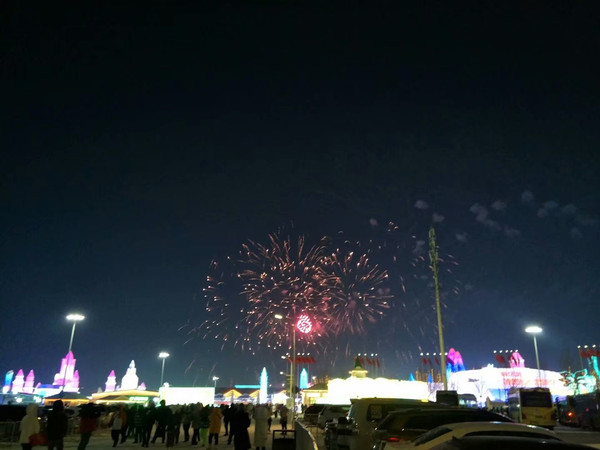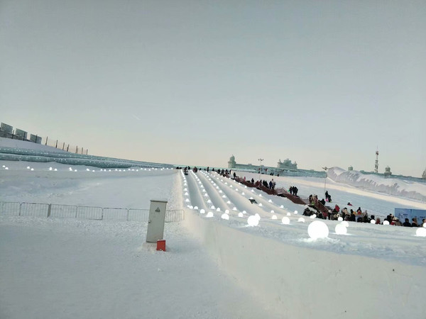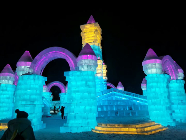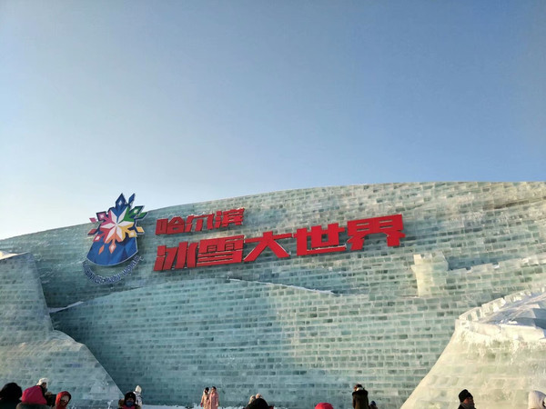 在中央大街逛罢,就要去此行的最后一站冰雪大世界了,这个时候才意识到,在这样的一条路上旅行,没有一个靠谱的交通工具真的太难了,也许你大部分的时间就花费在了等车上,平时半小时的路程,到了哈尔滨也许要用两个小时,到了冰雪大世界没走几步就感觉到真冷,比起亚布力,比起雪乡,比起市区,这里是真冷!人只有一直不停的走,才不会被冻住,手脚才会暖和,戴着口罩前行,哈气都把口罩打湿了,呼出的热气上升到帽檐上,额头上的帽檐前端都有点积冰,眼睫毛长的睫毛上都是一层冰霜,后来索性不戴了,但脸又冻的生疼。暖宝宝已经用到了极至,都还能感觉到从下而上寒彻心骨的那种寒冷。匆匆的看了几个标志性的冰灯以后,就直奔哈冰秀场馆外面排队去了,之前研究了攻略知道大滑梯和哈冰秀是重磅,可目测大滑梯排队至少上千人,得等两个多小时,果断放弃掉,排了半小时队进了哈冰秀场,事实证明,此举太过明智,严重推荐冰雪大世界的必选项目绝对是哈冰秀,一定一定不要错过!而且冰雪大世界的白天和晚上是不一样的效果,建议一定要早去,先玩项目再看演出,然后等天黑再观灯。而且最最重要的是,一定要穿的够厚,不然分分钟被冻的怀疑人生。