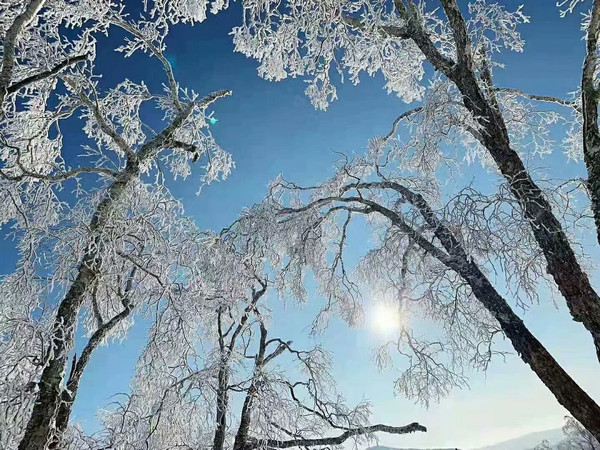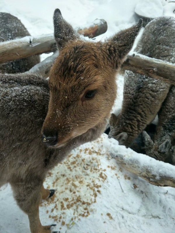 感慨完毕,稍做休整,进入驿站,看到外面一米多长的冰凌子,按导游的提示,把所有御寒的装备都穿上,准备为下一步徒步进入牧雪山村和十里画廊做好准备。 又是一顿难以言表的团餐以后,我们到达徒步景区,与导游约定好集合时间后就开始自由活动,先坐上雪圈,由越野车开道,穿越在雪道上,天空是数不尽的雾淞闪过,寒风像刀子一样划过皮肤,这个时候东北御寒三件套起到了决定性的作用,帽子、手套、围巾是必备的,尽量不要让皮肤裸露在空气里,不然你就会体验到无比冰爽的感觉。玩完雪圈,我们开启了徒步冰雪之旅,途中还见到了传说中的东北神兽“傻狍子”,据说这货如果一枪没被猎人打中的话,还会再返回看看猎人走没走?如果猎人再打它,它会把头埋到雪里,只露出带着一撮白毛的屁股,还真不是一般的傻。跟傻狍子愉快的合影完,进入牧雪山村,穿过十里画廊,亲临实境,多了一种融入童话世界之感,与大片大片的雪原接触,满目都是大片大片的白色,像棉花堆,又像云层,更像是用泡沫堆砌出来不真实的世界,每个人都逐渐抽离现实,生出幻生幻灭之感,每个人都禁不住涌入其中,倒进雪地里,愉快的翻滚,像是找寻了到了失去多年的童真,跟雪接触,除了冷,除了开心,没别的毛病!