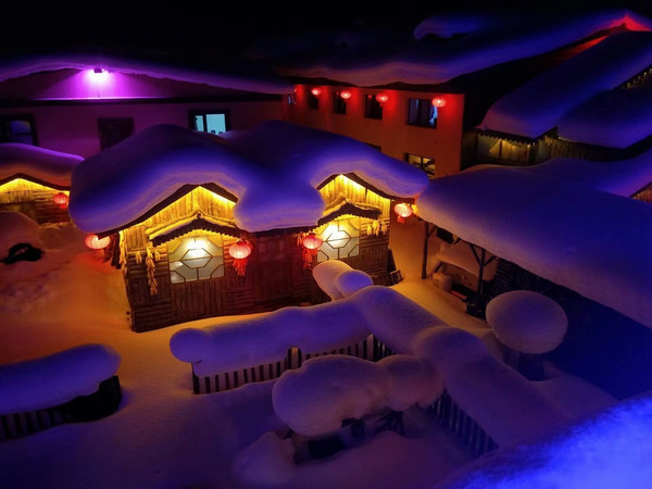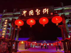 体验完无比惊验刺激的雪地摩托车,其他的雪地项目已经直接被我们PASS掉了,坐上大巴,直奔雪乡而去。到了雪乡,不过是下午五点,外面已经是黑漆漆的一片了,正赶上华灯初上,斑驳的霓虹点亮整个村庄。安顿住下,吃上此行最好吃的一顿团餐,东北饺子宴,我们就出门撒欢了。一出门就是雪韵大街,一条不很长不很宽却让游人流连忘返的街道,这是曾经的森林小火车道也是贯穿雪乡的一条主街道,这里有各式民居、各种小吃、各色商铺,售卖冰糖葫芦的雪人、成箱散落的冰棍儿、一筐筐的冻梨、冻柿子、冻山楂,东北的食物是不需要进冰箱的。到处都是天然冰箱,鱼啊肉啊水果啊随手往外面一扔,分分钟就冻上了。我最爱的是冻梨,融化后一口咬下去,那叫一个冰爽!简直就是人间极品!吃完冻梨,到了雪乡最经典的梦幻家园门口,拿出导游一早就发给人手一张的二人转门票,准备进去参观,可同行的迷糊蛋小伙伴翻遍全身也没找到她的票,没办法,我和又又只好陪她回房间去找,结果在返回的途中,她的票没找到,我的票。。。又丢了。到门口一问,现买的票要排到两三个小时以后才有位子,无语了!