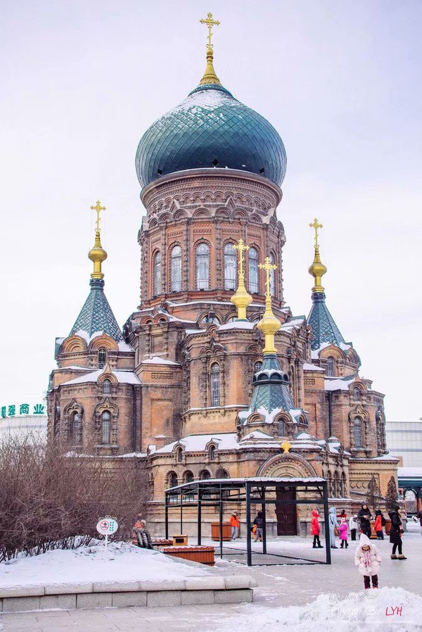 回到哈尔滨市区的第一站,肯定是标志性的地标建筑圣·索菲亚教堂,来之前预知在大修缮中,虽然不能入内参观,但是大部分的整体外观还是能够欣赏到的,因为之前瞻仰过一次,再见时就没有初见时的震憾。它是远东地区最大的东正教堂,始建一九零七年三月,是沙俄入侵东北的历史见证和研究哈尔滨市近代历史的重要珍迹,也是沙俄东西伯利亚第四步兵师修建的随军教堂。由俄国建筑师克亚西科夫主持设计,气势恢弘,精美绝伦, 是拜占庭式建筑的典型代表,它的墙体全部采用清水红砖,中部突起很高的、带拱券长窗的16面体鼓座,上冠巨大饱满、装饰精美的洋葱头穹顶,统率着四翼棱锥式、大坡度的四个大小不同的帐篷顶,形成主从式结构组合。它的整体建筑中透漏着历史的味道,信仰的光芒。天气太冷,匆匆的拍完照,就到附近觅食去了。按网上推荐找了一家包子铺吃上了此行第一顿自费餐,小伙伴也如愿吃到了她一直心心念念的哈尔滨名小吃“锅包肉”,虽然我喜吃肉,但这种酸甜油腻的菜品还是不怎么对我的胃口,不过,来了,尝过,就好!包子配上家常小炒,再来小二两牛栏山,我这贪怀之情无论走遍大江南北也割舍不了,二两酒下肚,从内到外都透着暖和气,难怪都说东北人能喝,在这种环境里生存,没点酒量怎么混的下去,分分钟会冻惨。
