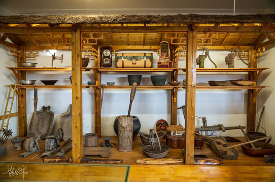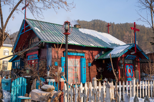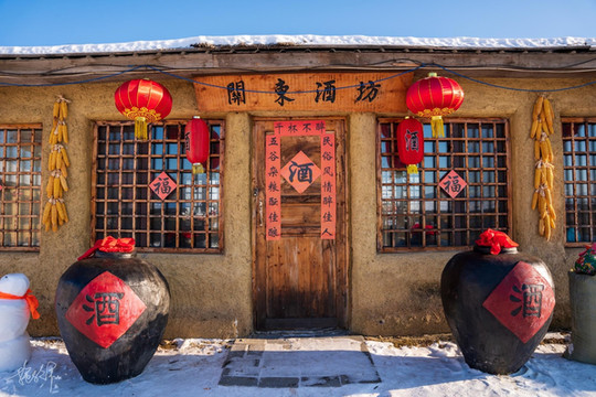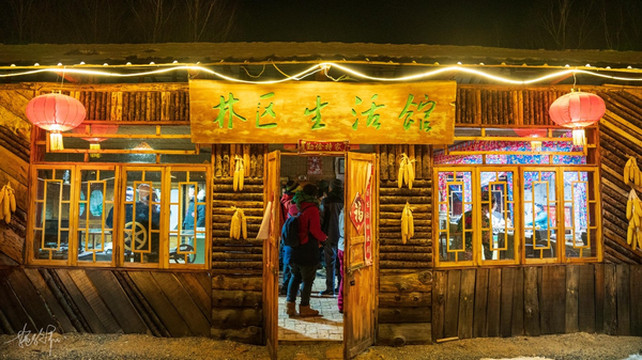 一整片泥巴房、大烟囱,门口、墙上是一串串的玉米、辣椒,我在村子里随意走走,几乎家家户户都可以进去熟悉一下那个年代的装修感。有的房间里展示的是 东北 的“剪窗花”,也有一个大房子里面专门收集了林区生产生活的老物件来展示林区生活馆,也有纯纯的酿酒坊,还有专门展示 东北 婚嫁的一片区域……