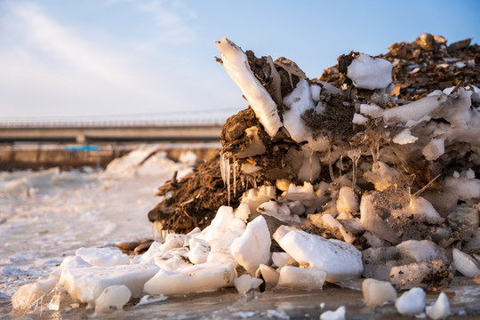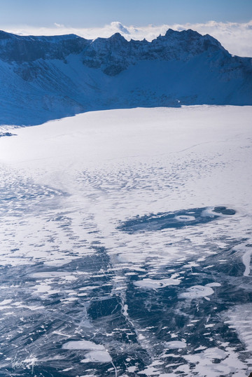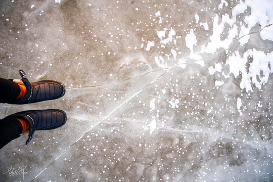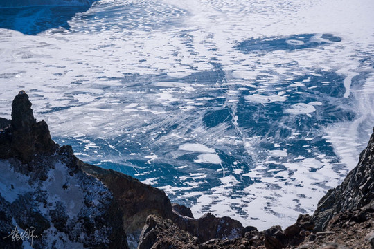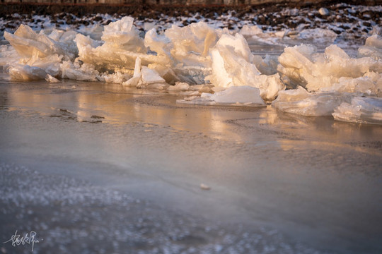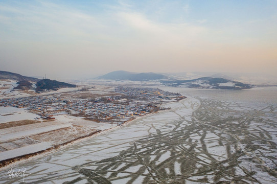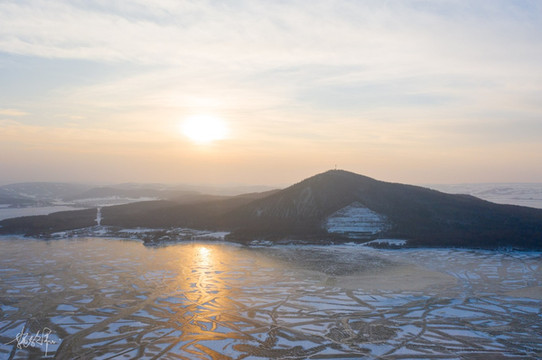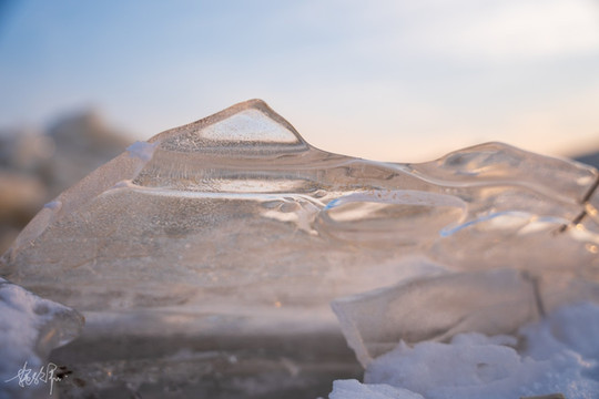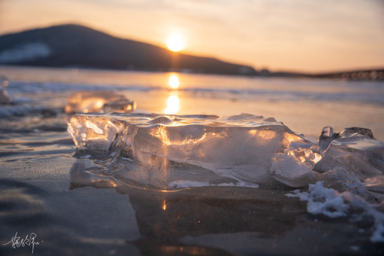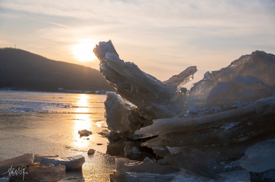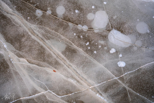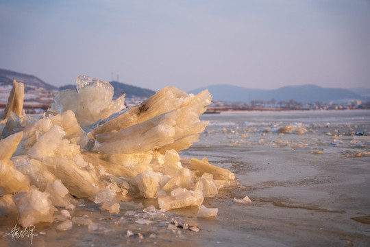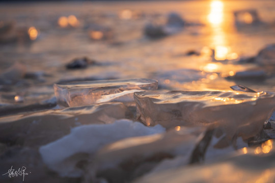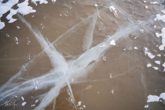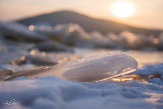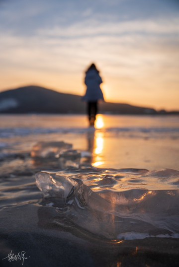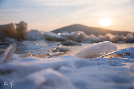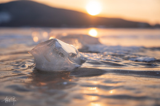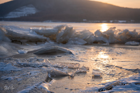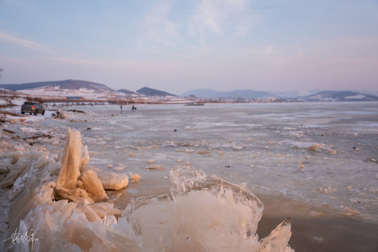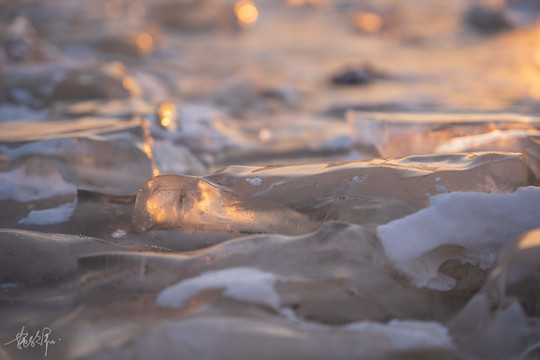 镜泊湖的冰层应该非常厚的,一开始要走的时候还怕怕的,小妖都说放心走没事儿,这车开上来都没得问题。严实的冰块、透明晶莹的冰、错综复杂的冰裂、圆圆的气泡冰……都超级美,阳光的余晖下它们呈现金黄色,相信如果中午时分,这里会像蓝冰一样美。