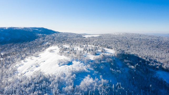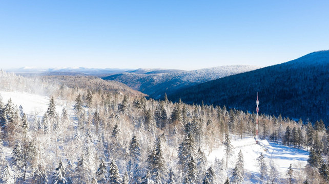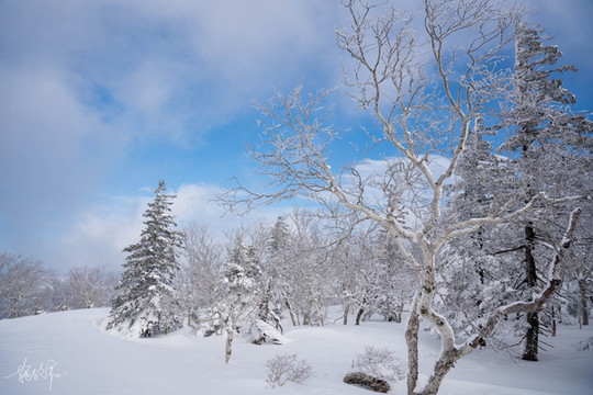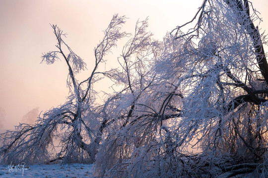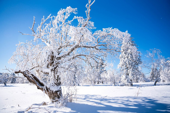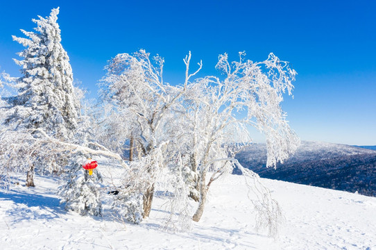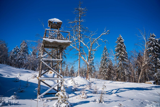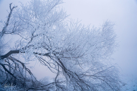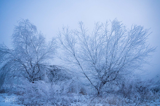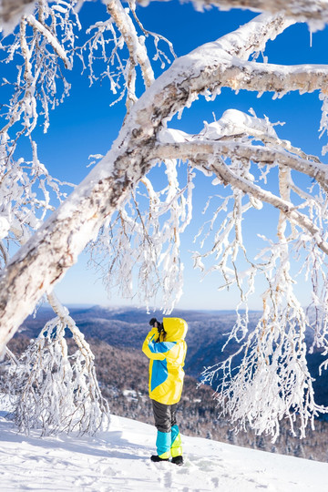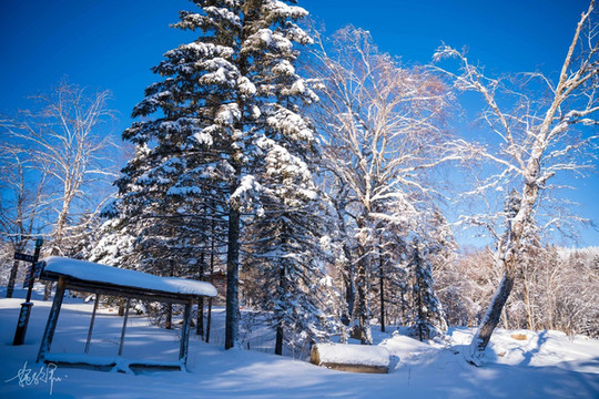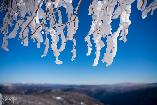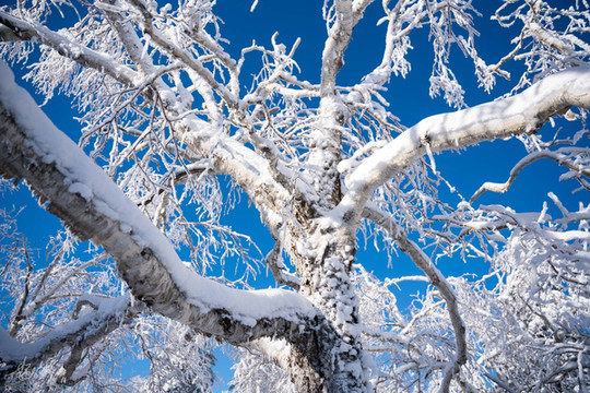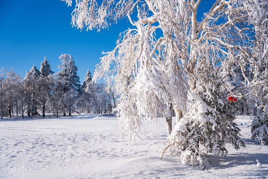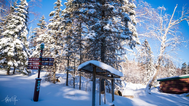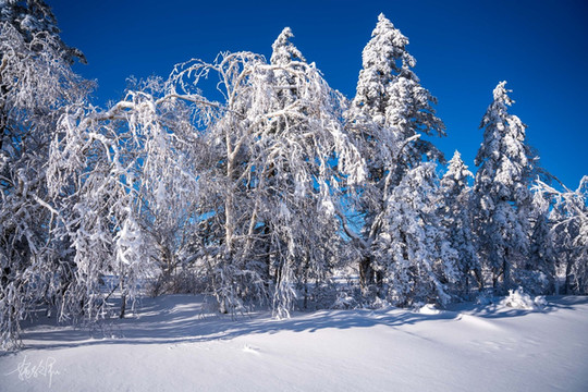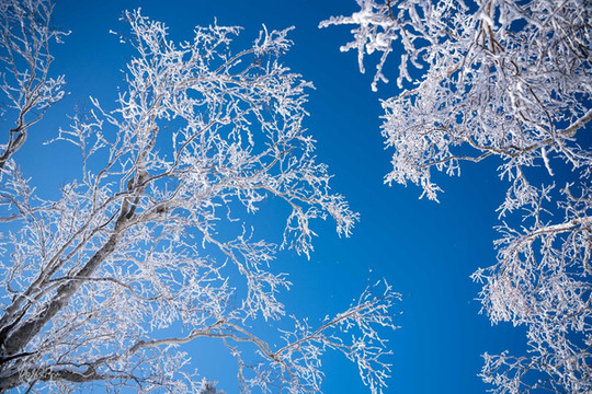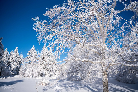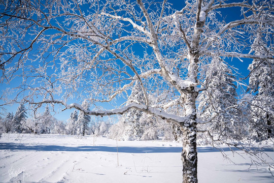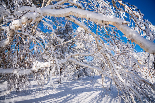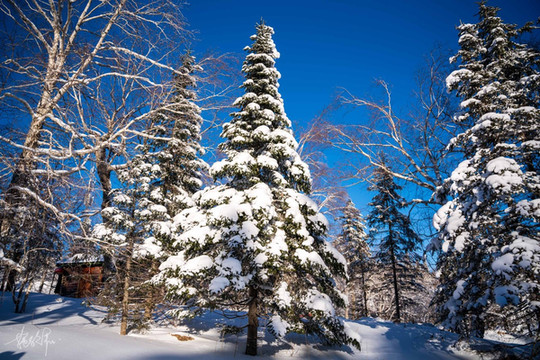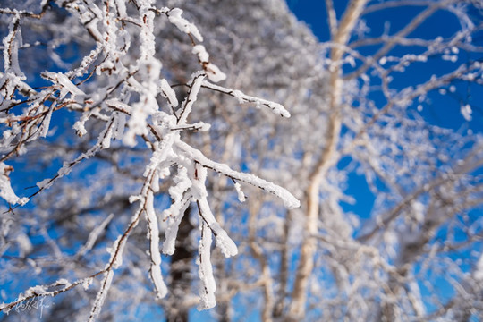 我们看到的是桦树和松树,冰雪树挂还有着湛蓝的天空,两种树枝不一样的长向,正好丰富了画面,笔直和弯曲相呼应。