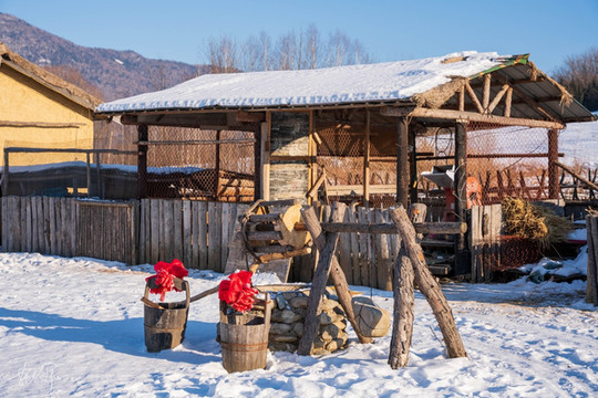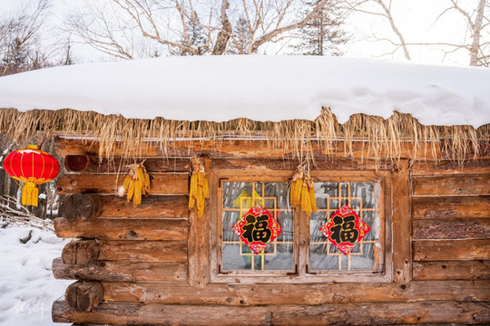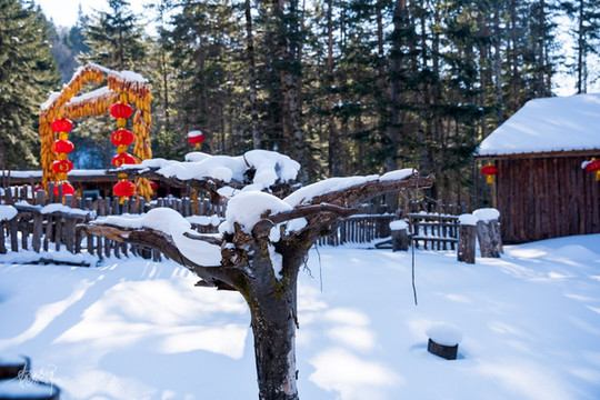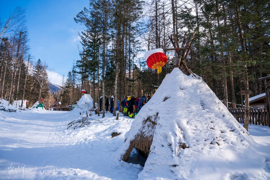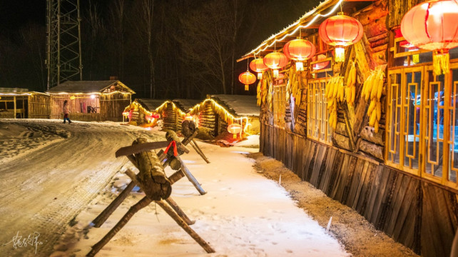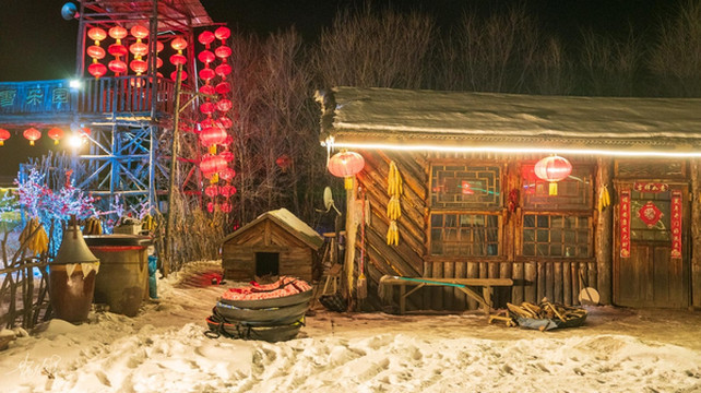 走过村子前面就是嘉年华游乐场,包括有雪地转转、雪圈和雪爬犁,我们一块坐了一回雪地转转,机器一开,我们坐在轮胎上顺时针旋转,很有游乐场的感觉。边上是一个模仿 东北 土匪的老窝,又让你温习了一遍对联——“天王盖地虎”,嗯,嗯?“小鸡炖蘑菇!