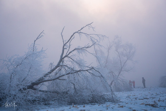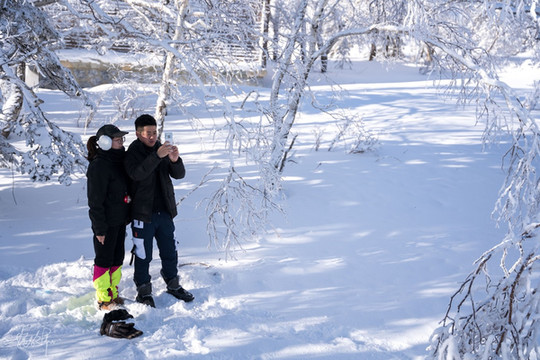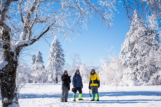 我们先是乘坐雪龙号上雾凇顶去看一眼 黑龙江 第一峰大秃顶子,在山顶起雾,雾凇倒是没有多少,走了一小段路以后,冷得不行,很快我们便下山乘坐雪地摩托来到了《爸爸去哪儿》的拍摄地。