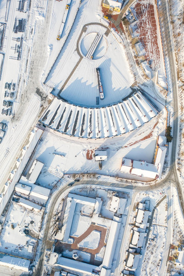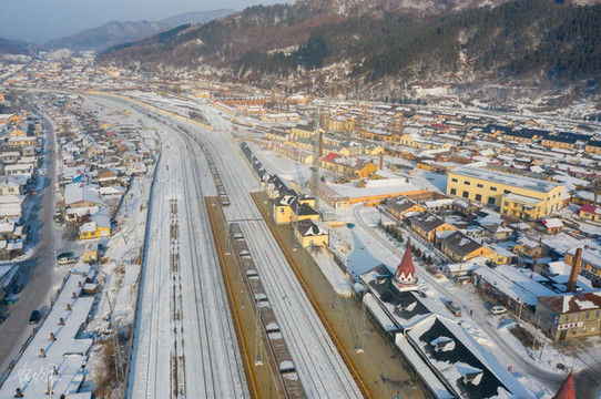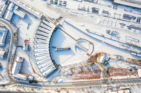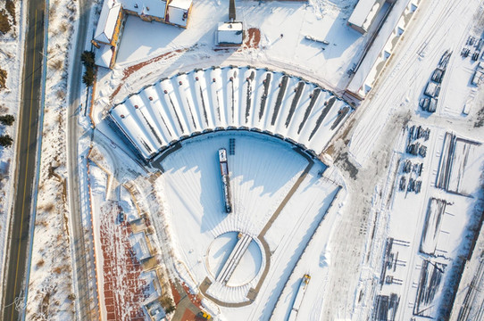 横道河子镇最出名的是 中东 铁路当时规模最大的扇形机车库,那建筑造型简直美呆了,无人机飞上去,这就像是一台拉开的手风琴, 太特 别了。我们的行程给横道河子镇的时间终究还是太少了,我都来不及去亲近这个机车库,它用了近百年的时间,一直到了上世纪九十年代才退休。