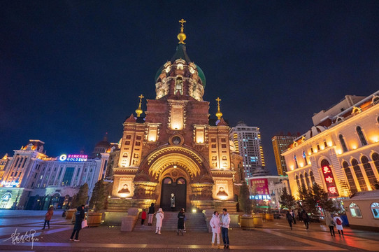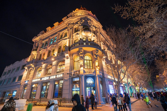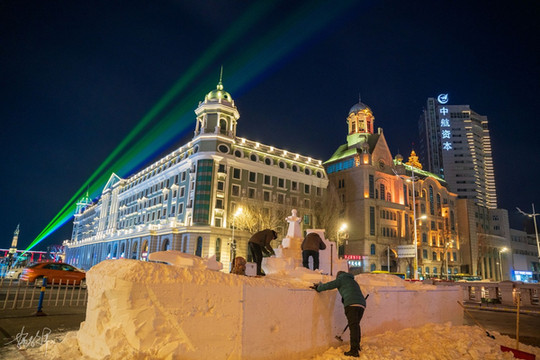 我彻底被一栋又一栋的建筑给迷住了,要不是太冷了,估计我可以看一天。 中东 铁路的建造给 哈尔滨 带来了许多仿欧式建筑,我们闲逛在中央大街时,街头两边已经开始在做冰雕,夜晚灯光的渲染使得这些建筑更加浪漫。