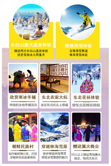今日特色:雪乡日出、冬捕、冰上十项活动体验+网红雪圈车+长白山雪地露天温泉
