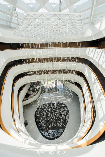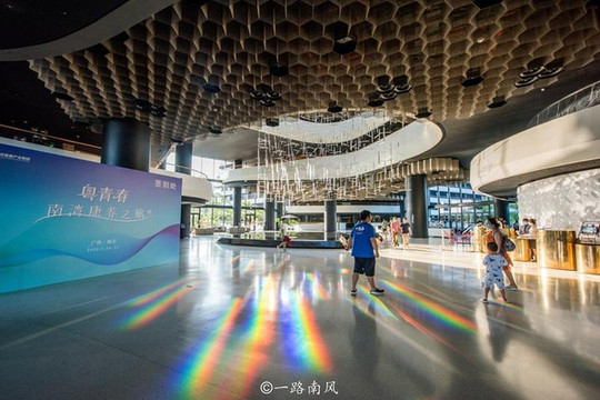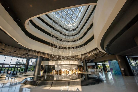 南沙花园酒店位于南沙区海滨路滨海公园内,是我们旅行的第二个晚上下塌的酒店。这家酒店很有设计感,在阳台上就能看海,如果不想打开阳台门,拉开窗帘,在房间里就可以欣赏到美丽的珠江口景色和不远处的虎门大桥。这间酒店的大堂设计堪称艺术品。在大堂中心位置,一千多根棱柱从高空往下看非常规则,仰视又是不一样的视觉效果。这些三菱棒会随着阳光和灯光的变幻,反射、折射出不同的光影效果,在天气晴好的时候,如果时间刚刚好,还能在大堂看到彩虹。