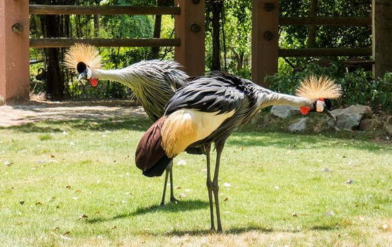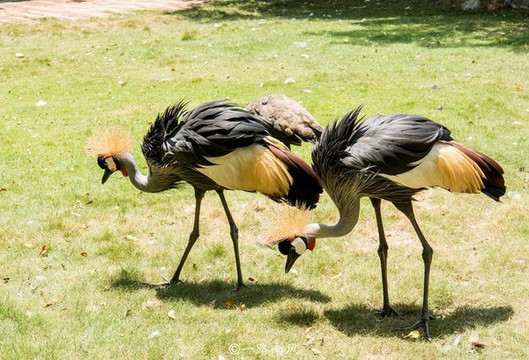 继续往前游览,彩鹦谷、金银池塘、白鹳滩等景观都各具特色。游览的过程中,高颜值的黑冠鹤引起我们的注意,它们在草地上休闲散步,似乎在寻找什么美食。据介绍,黑冠鹤是一种留鸟,喜欢集群而居,通常居住在开阔的沼泽地区,体长达到105厘米,绒羽是黑色的,身体后半部分的羽毛是黄色的,冠上还有一团像盛开花蕊一样的毛发。这种鸟类体态高雅,是动物界的“绝色美女”和“再世潘安”。黑冠鹤主产于西非和中非,是尼日利亚的国鸟,很荣幸在南沙也能欣赏到它们的美态。