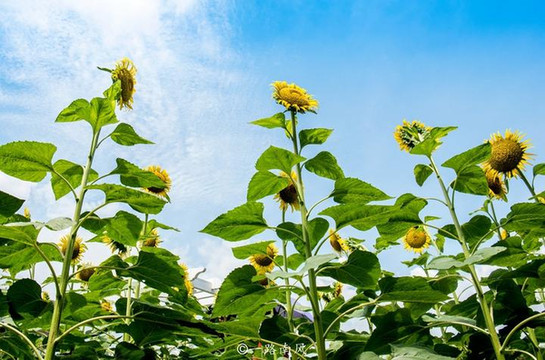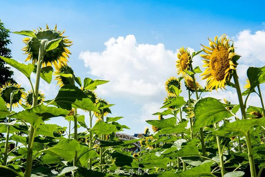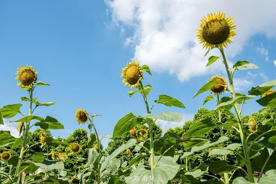 葵花挺拔,朵朵向阳,走进葵花林,就像走进红黄两色混搭的海洋,夏天之所以是赏葵佳季,主要是因为这个季节晴天较多,在蓝天白云的映衬下,葵花园显得更加大气、梦幻。