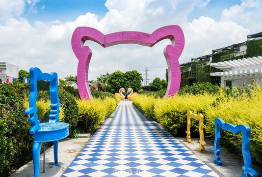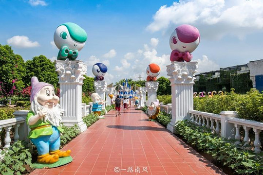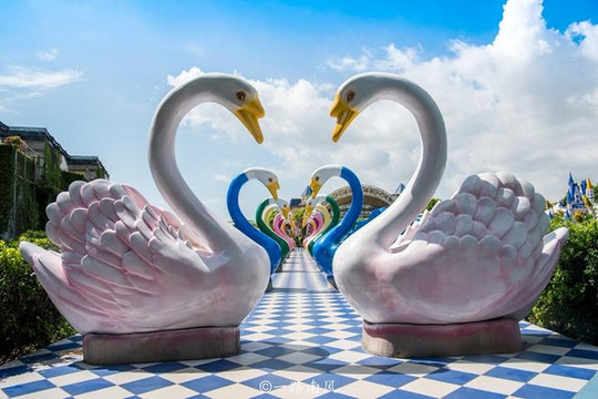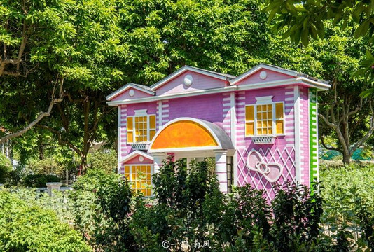 公园里随处可见各种可爱的卡通彩塑或小房子,有小矮人、粉红色KT猫造型屋、童话城堡模型、彩色的天鹅等等。