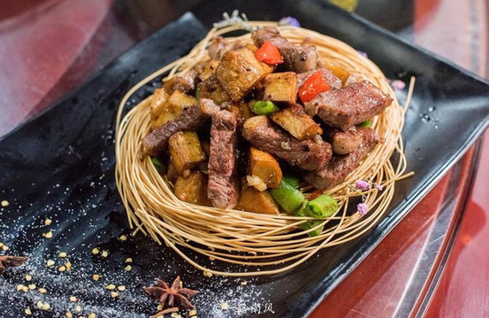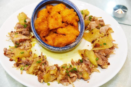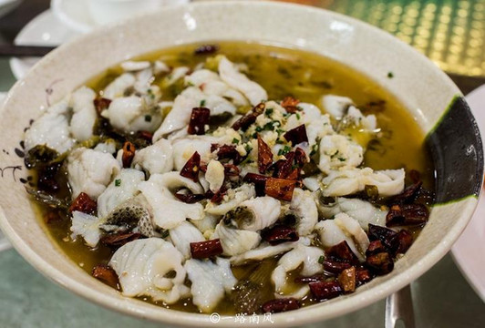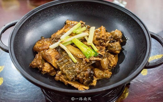 捞鸡:非常有特色的一道菜,用一个竹簸箕盛装,切好的鸡肉组成鸡的形状摆放在簸箕的中间,旁边围了一圈调料,卖相看起来很霸气。吃之前工作人员会帮忙将调料拌一拌。这个鸡肉质香嫩,口感极佳。