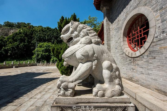 穿过牌坊,首先看到的是山门建筑,山门前有两只呈坐姿状的石狮,它们凝视着茫茫大海、注视着人来人往,不怒自威。继续拾阶而上,各种宫殿式建筑呈对称格局分布在石阶两旁,蓦然间有种游览皇帝后花园的感觉。从建筑的格局、细节处的风格来看,南沙天后宫和承德避暑山庄、北京颐和园的部分景观很像,不同的是南沙天后宫是绝佳的观海处,其他两处名胜看不到大海。