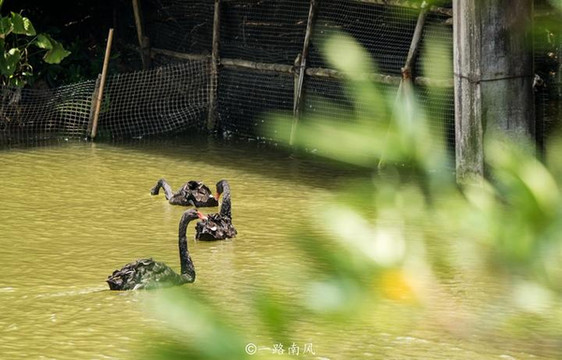 天鹅湖就在园区的主入口旁边,黑白两种天鹅在碧水中自由嬉戏,场面温馨。据工作人员介绍,天鹅湖的水域面积大约10万平方米,湖中有从荷兰引进的疣鼻天鹅和黑天鹅,它们形影不离,堪称动物界的恩爱典范。
