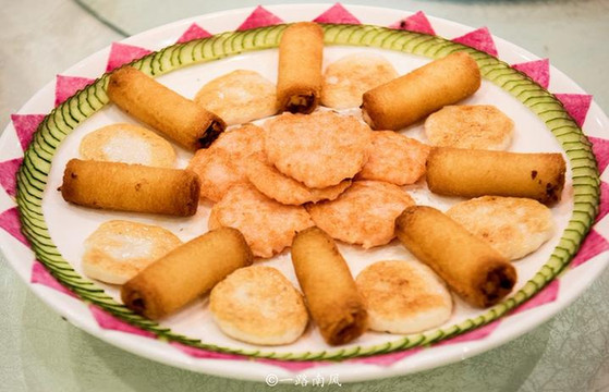 金香三拼大:里面有虾饼、墨鱼饼和炸牛奶,都很有特色。