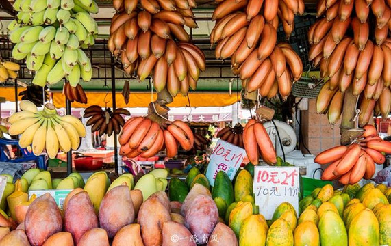 一路前行游览,但见菜市场水果档的大姐卖力地招揽顾客,红皮香蕉和红皮芒果很抢眼。