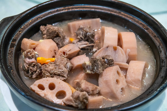 上来的第一道菜:成骨煲淋莲藕,这道菜非常有广东的味道。将盖子掀开的一瞬间,大骨汤的香味扑鼻而来。将形状合适的成骨焯水,去血沫。然后就放入到传统的沙煲中,不添加过多的调味品。保持火候,一直煲,等骨头中的骨髓已经化掉,加入大块的莲藕,等候几分钟,起锅前加少许盐佐味。色白而浓重的汤是这道菜的灵魂所在。最美味的菜肴往往不需要多余的调味,最朴实的做法总能让骨汤的鲜美和莲藕的清香恰到好处的结合起来。饭前一碗汤,真是养生又舒畅!