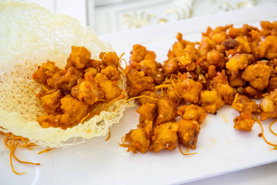 喜欢吃甜品的人也有口福了,金香三拼大一定能让你得到满足。金黄酥脆的炸牛奶,和虾饼,墨鱼饼放在一起,这是一个鲜甜口味的碰撞。外壳酥脆,咬一口就能听到咔咔的声音。但里面还是软嫩的口感,双重的口感带来的必然是双倍的快乐,不知道你会给这道菜打几分?