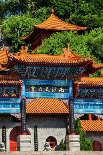 南岭塔。山门是南沙天后宫的正门,门内殿堂左右两侧分别站立着千里眼和顺风耳的塑像,传说他们被天后收服,成为给鱼民预报海浪风涛信息的神灵。