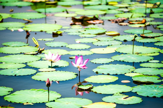 迎着习习清风,一步就是一景,在不知不觉中早已误入藕花深处。游船在莲叶之中穿行,看着碧绿的荷叶托起一朵朵荷花,不禁就想起那句著名的诗句“接天莲叶无穷碧,映日荷花别样红。”随风摇曳的荷花在一望无际的田田荷叶间起舞,朵朵风姿绰约,散发暗香,秀美绝伦,构成夏日里醉人的风景。让人心旷神怡,流连忘返。