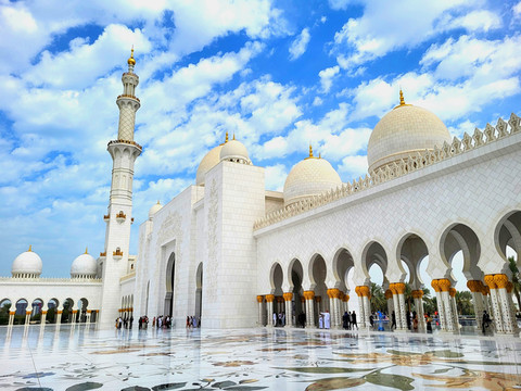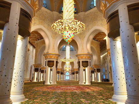 据介绍,谢赫扎伊德清真寺是中东地区最大的清真寺,耗资高达55亿美元,内部以数以万计的宝石贝壳镶嵌,独具欣赏价值的是每盏80万美金的施洛华世奇水晶吊灯,还有全世界最大的一块手工地毯。整个建筑群都用来自希腊的汉白玉包裹着,白色典雅的外观,在蔚蓝的天空映衬下,显得格外庄严肃穆。