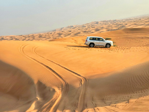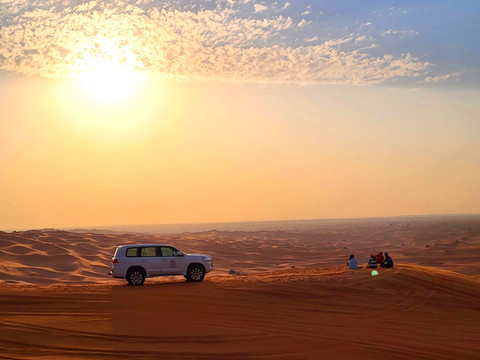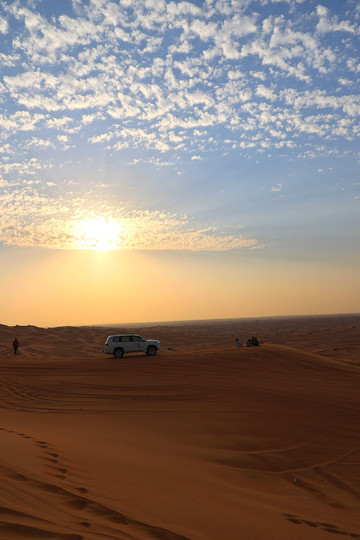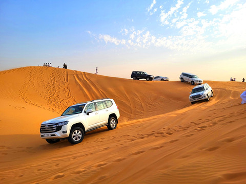 下午,参加了迪拜沙漠冲沙的自费项目。由沙漠冲沙活动相关公司派车,到我们下榻的酒店把大家送到距离40来分钟车程的迪拜沙漠营地。稍事休息一下,就乘坐4WD越野车,出发进入沙漠深处,开始进行号称冒险家游戏—冲砂。之后到达沙丘顶峰停留片刻,让大家下车休息和拍照,欣赏沙漠风光和日落景观。返回途中还会到另外一处沙漠营帐,在那里有骑骆驼、看民俗表演和享用阿拉伯晚宴等系列活动。