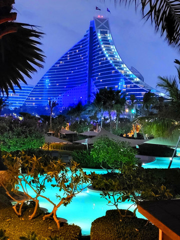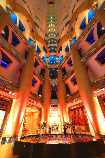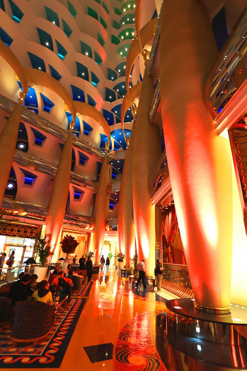 晚上,全体团友参加了7星帆船酒店内自助晚餐的自费项目,有幸进入到迪拜最负盛名的帆船酒店参观游览。傍晚时分,我们来到酒店停车场,然后步行穿过前往酒店的海滨栈道,又绕着酒店大楼闲逛了一周。一边观赏着这里颇具特色的建筑和海滨宜人的风景,一边拍照留念,最后来到富丽堂皇、金碧辉煌的酒店大堂。这里的奢华超乎了你的想象;这里的景致让人眼花缭乱。参加这个慕名而来的自费项目虽然价格不菲,但却是一件赏心悦目的乐事,大家啧啧称赞,感觉不虚此行。
