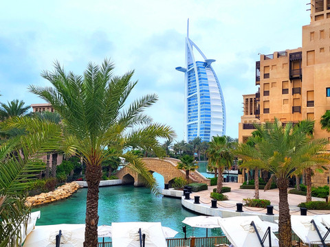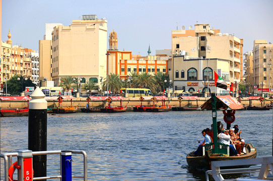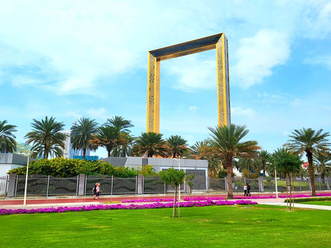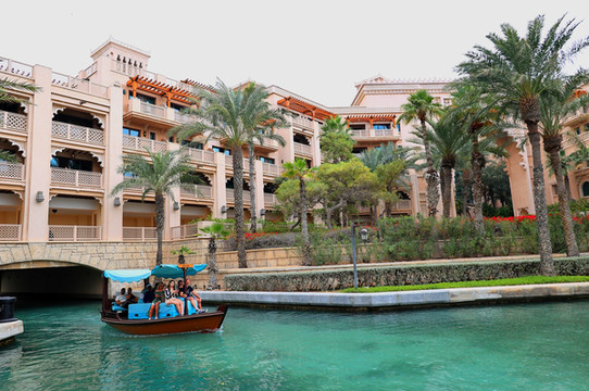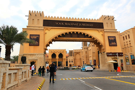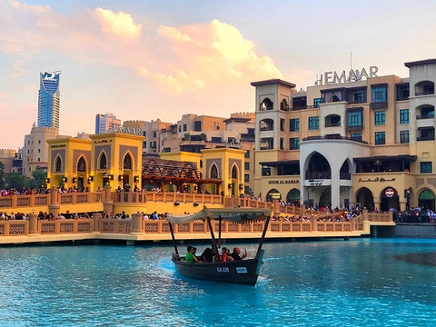 参观完伊朗小镇,便前往迪拜历史中心的迪拜湾,在迪拜河乘坐阿拉伯特色水上Tasi,分别从船上和岸边不同视角,观赏迪拜湾多彩风情;之后导游又带着大家到了迪拜市区内的地标式建筑迪拜金相框观赏和拍照;接着来到紧邻帆船酒店的朱美拉古城(运河古镇)游览,欣赏着阿拉伯城堡的大气庄严,古运河的清幽宁静;遥望远处帆船酒店的摩登亮丽,显得别有风趣。