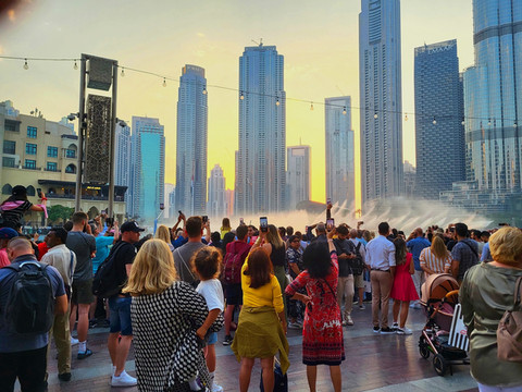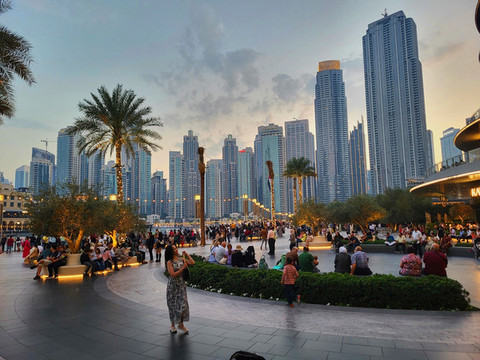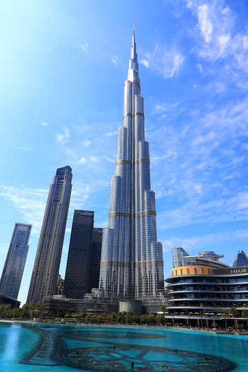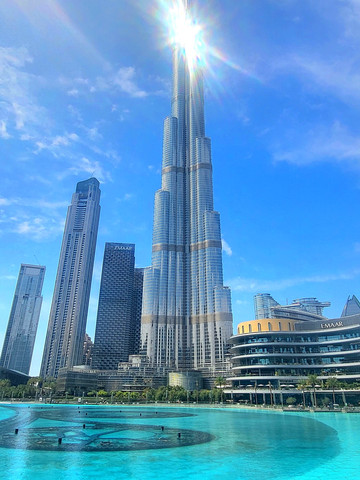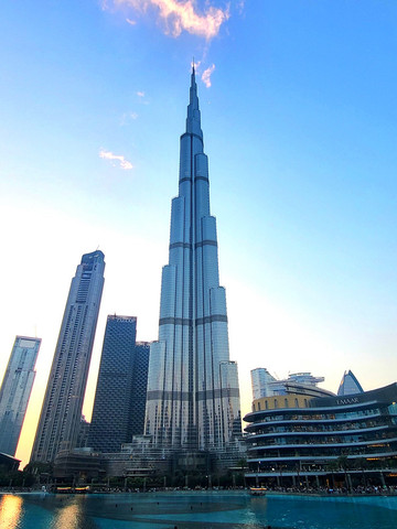 哈利法塔(迪拜塔)是世界第一高塔,也是迪拜标志性建筑,以828米162层的绝世高度耸入迪拜云端,是结合了艺术、工程学和传统文化的建筑杰作。在这里的观景台和喷泉广场,能近距离观赏其壮观的样貌。以前只是在新闻媒介中看见过,今天身临其境,在观景台仰望着熠熠生辉、高耸云天的塔楼,此情此境还是挺令人震撼的。