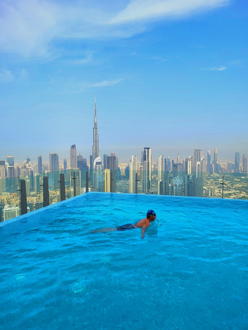 今天的行程很轻松,团队上午10点才集合。早上起床洗漱后来到酒店74层的自助餐厅,慢悠悠的尽情享用品种丰富的早餐;又到了75层的天台上休息闲逛,边赏景、边拍照;还在户外无边泳池游泳戏水,好不惬意。